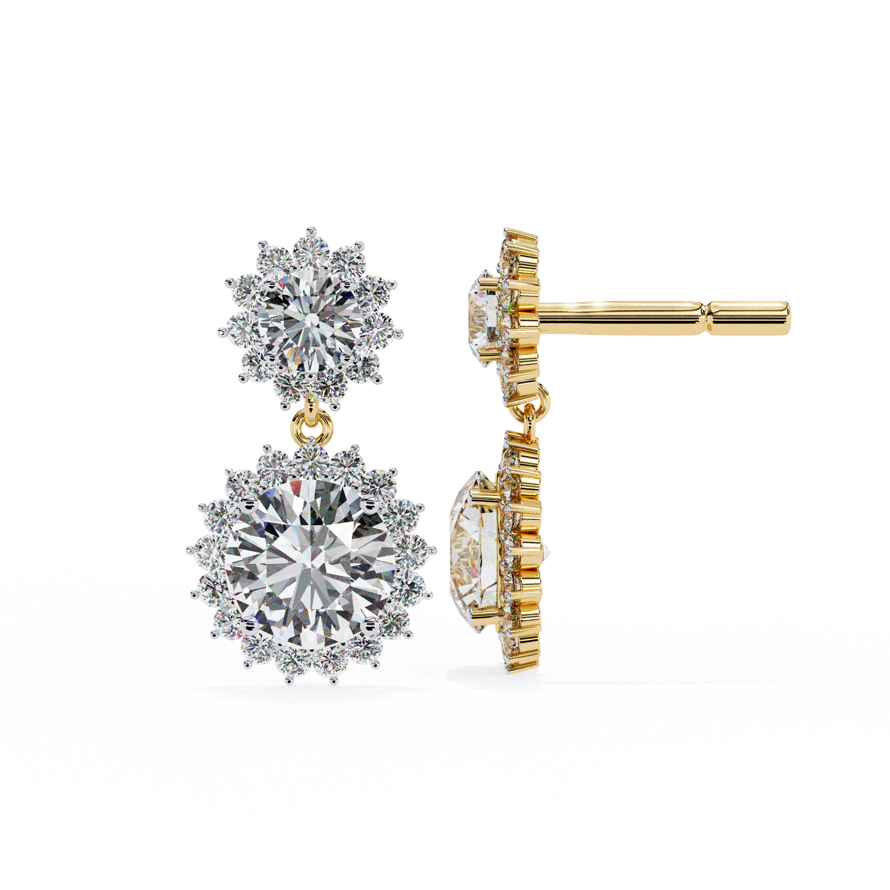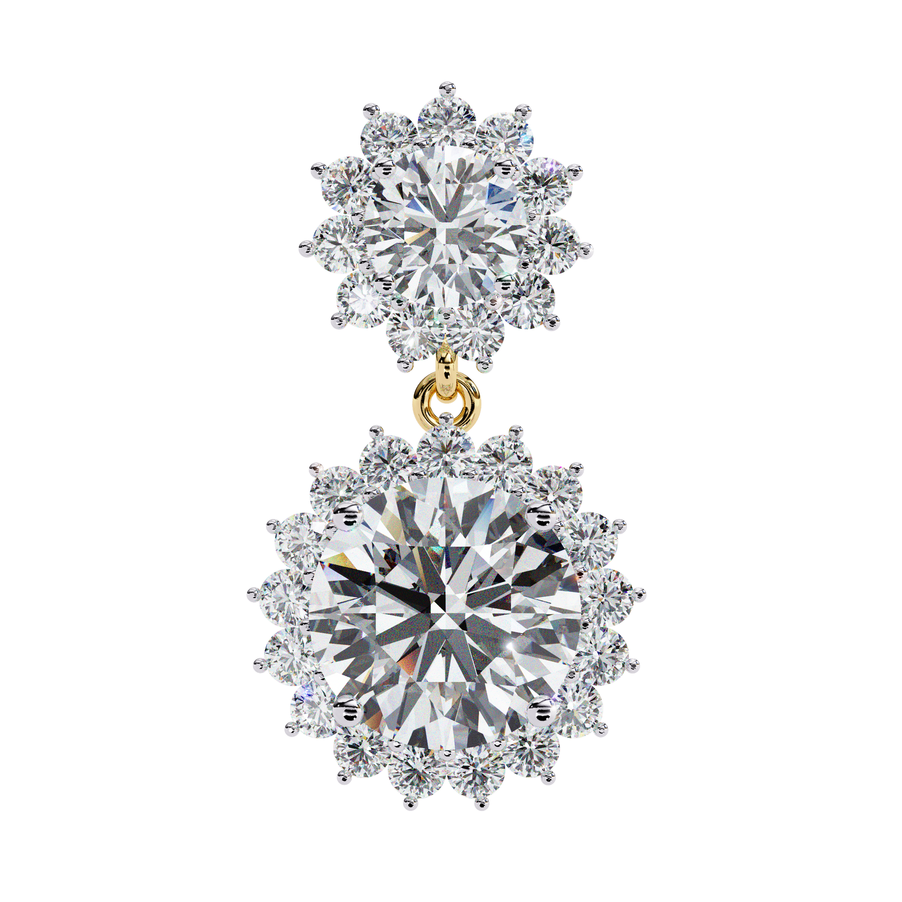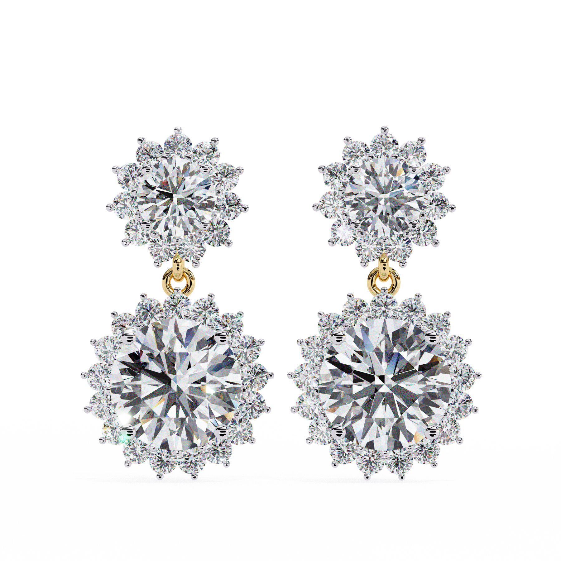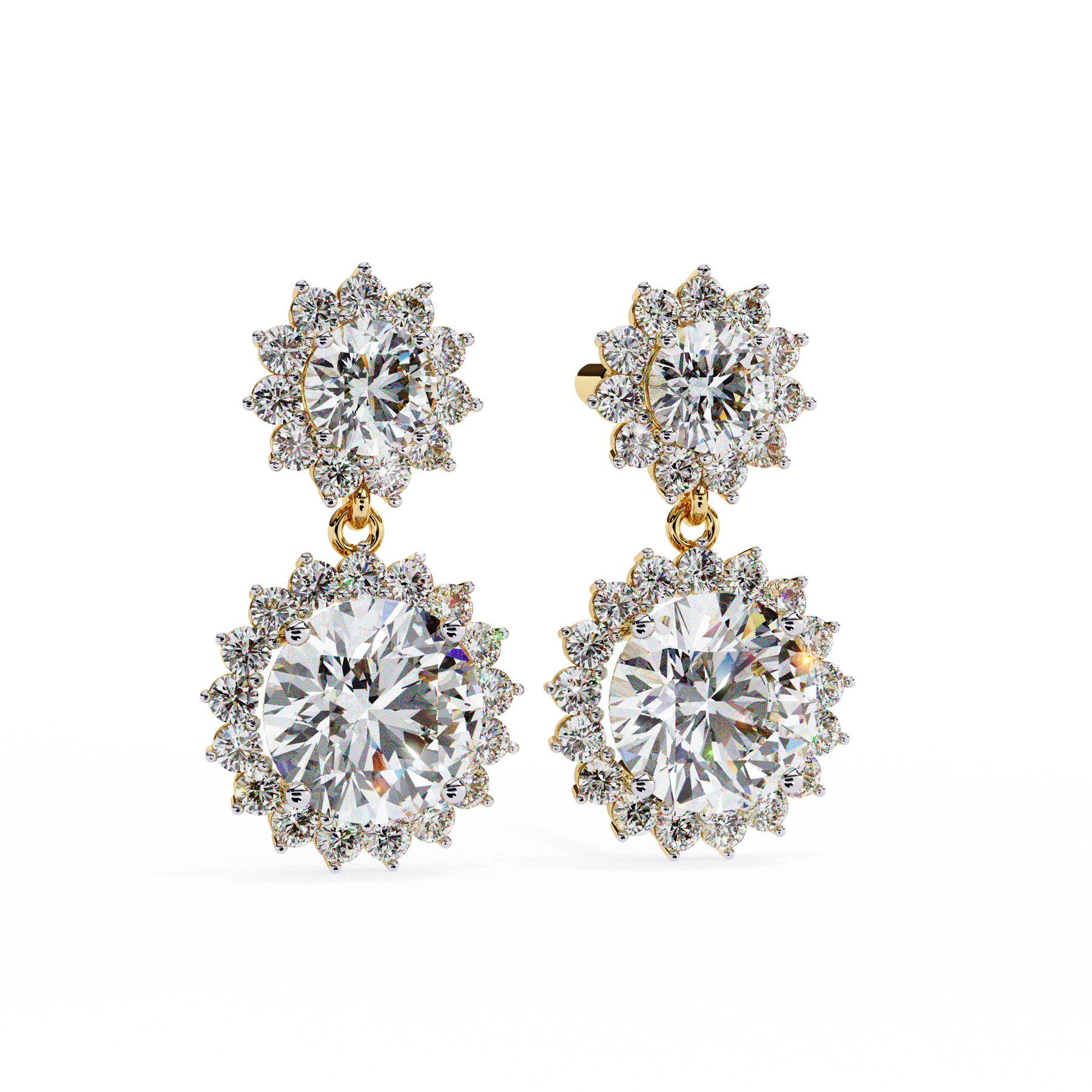 Brilliant round cut center stones framed by sparkling floral halo clusters create breathtaking double drop earrings. Designed in fine solid gold, these elegant dangle studs offer exceptional brilliance, romantic charm, and timeless sophistication—perfect for weddings, anniversaries, and refined evening glamour.